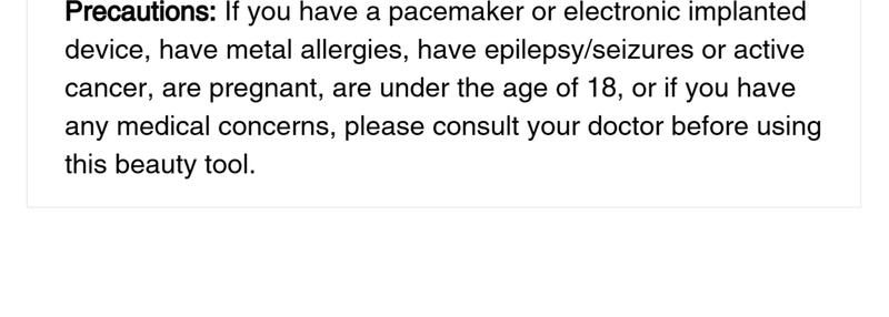 - Precautions: If you have a pacemaker or electronic implanted device, have metal allergies, have epilepsy/seizures or active cancer, are pregnant, are under the age of 18, or if you have any medical concerns, please consult your doctor before using this beauty tool.